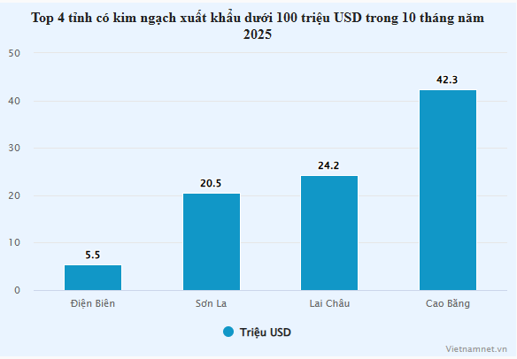Theo đó, trong 10 tháng qua, 4 tỉnh vẫn có kim ngạch xuất khẩu dưới ngưỡng 100 triệu USD, gồm: Cao Bằng đạt 42,3 triệu USD, Lai Châu 24,2 triệu USD, Sơn La 20,5 triệu USD và Điện Biên 5,5 triệu USD - là tỉnh có kim ngạch xuất khẩu thấp nhất cả nước.