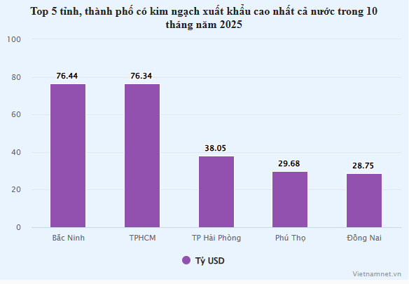 Đáng chú ý, với 76,44 tỷ USD, Bắc Ninh đã vươn lên dẫn đầu cả nước về xuất khẩu hàng hóa trong 10 tháng năm 2025, chính thức vượt TPHCM. So với cùng kỳ năm ngoái, kim ngạch xuất khẩu của tỉnh Bắc Ninh tăng mạnh 30,6%.