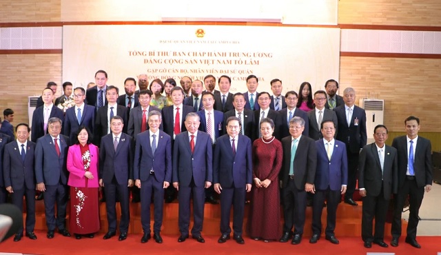Tổng bí thư Tô Lâm gặp gỡ cán bộ, nhân viên Đại sứ quán Việt Nam và cộng động doanh nghiệp Việt Nam tại Campuchia ngày 6-2-2026. Ảnh: HIỂU MINH