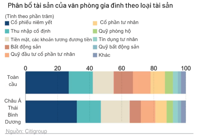Theo một báo cáo của Citi Wealth công bố vào tháng 9, các văn phòng gia đình tại châu Á phân bổ tỷ trọng lớn nhất trong danh mục đầu tư cho cổ phiếu niêm yết (32%), cao hơn mức 27% của các văn phòng gia đình khác trên toàn cầu. Các văn phòng gia đình châu Á cũng nắm giữ 18% tài sản dưới dạng tiền mặt, cao hơn mức 13% của các đối tác toàn cầu.