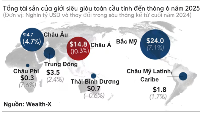 Theo dữ liệu của Wealth-X, châu Á là nơi tập trung số lượng cá nhân siêu giàu lớn thứ hai thế giới cả về số lượng và giá trị tài sản. Tính đến tháng 6, tổng tài sản của giới nhà giàu châu Á đạt 14.8 ngàn tỷ USD, gần bằng mức 14.7 ngàn tỷ USD của châu Âu. Tuy nhiên, tốc độ tăng trưởng tài sản của họ gần như gấp đôi so với các đối tác tại châu Âu.