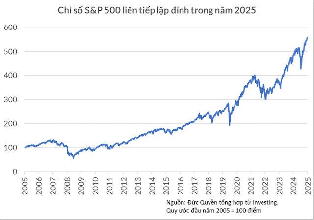 Ở Mỹ, chỉ số S&P 500, gồm 500 cổ phiếu lớn nhất, hôm 15/09 đã lần đầu vọt lên trên 6,600 điểm; chỉ số Nasdaq Composite, gồm đa phần cổ phiếu công nghệ, đang ở vùng đỉnh lịch sử 22,300 điểm, chỉ số Dow Jones, gồm 30 cổ phiếu blue-chip lâu đời, cũng đang ở khu vực cao nhất mọi thời đại 45,700 điểm. Ngay cả chỉ số ít được biết đến hơn như Russell 2000, gồm các cổ phiếu vốn hóa nhỏ, cũng đang ở mức kỷ lục trên 2,400 điểm.