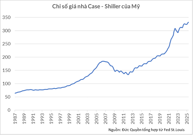 Không chỉ chứng khoán, giá nhà đất tại Mỹ thể hiện qua chỉ số Case-Shiller, cũng đang ở mức cao chưa từng thấy. Giá Bitcoin đang ở quanh vùng đỉnh lịch sử 110,000 USD, giá vàng chạm 3,700 USD/ounce, cao gấp hơn 100 lần so với khi Mỹ chấm dứt chế độ bản vị vàng 35 USD/ounce năm 1971.