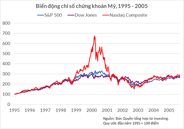 Trong bong bóng công nghệ “dot com” cuối thập niên 90, chỉ số công nghệ Nasdaq tăng vượt trội so với các nhóm cổ phiếu khác
