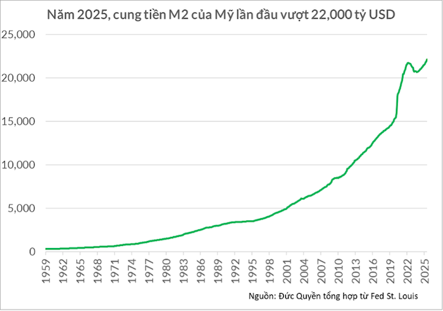 Nhìn lại giai đoạn đại dịch COVID-19, Cục Dự trữ Liên bang Mỹ (Fed) đã hành động quyết liệt để giải cứu nền kinh tế. Chỉ trong tháng 3/2020, Fed đã hai lần hạ lãi suất quỹ liên bang, đưa về mức thấp kỷ lục 0 – 0,25%. Song song với đó, Fed và chính phủ Mỹ đã bơm ra hàng nghìn tỷ USD để kích thích kinh tế. Chỉ trong ba tháng đầu đại dịch, cung tiền M2 của Mỹ đã tăng vọt gần 2,400 tỷ USD. Đến đầu năm 2021, tốc độ tăng trưởng cung tiền M2 có lúc đạt 25 – 27% so với cùng kỳ năm trước.