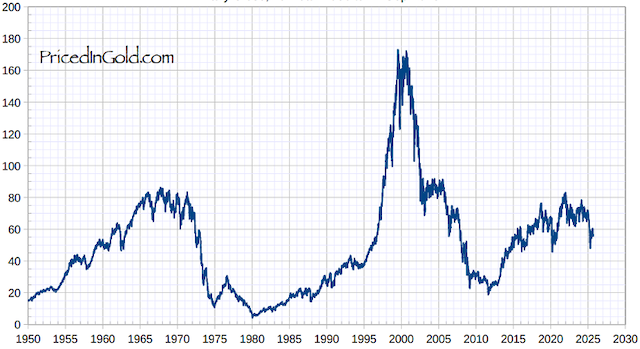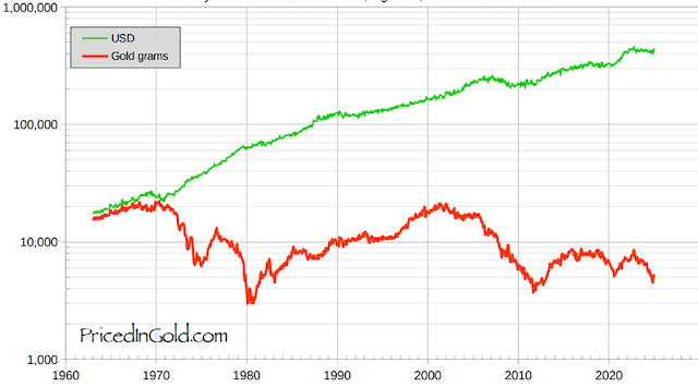Chỉ số S&P 500 định giá theo gram vàng. Giá đóng cửa hàng ngày từ 1/1/1950 đến 12/09/2025