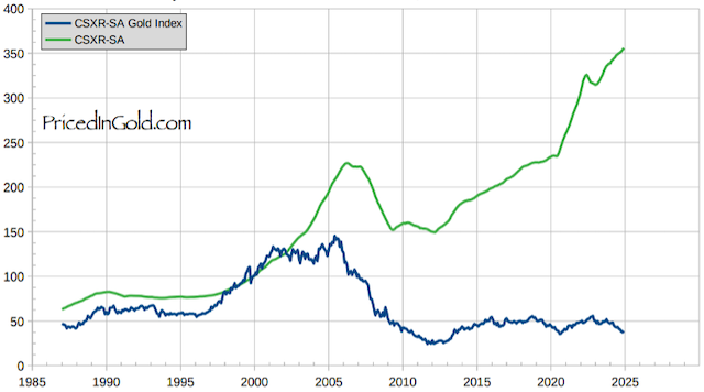 Chỉ số giá nhà Case-Shiller tại Mỹ tính theo vàng hiện nay chỉ ngang bằng với thập niên 1980, trong khi chỉ số giá nhà tính theo USD cao hơn gần 500%.