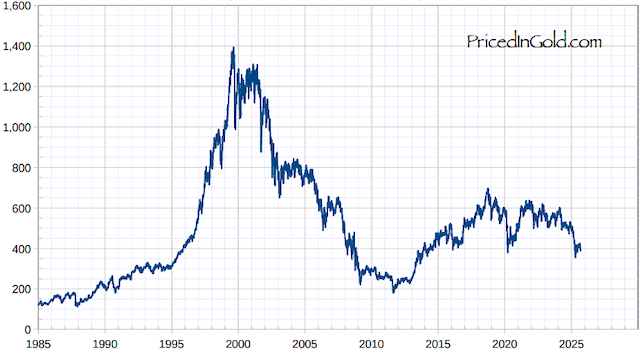 Chỉ số trung bình công nghiệp Dow Jones định giá theo gram vàng. Giá đóng cửa hàng ngày từ 01/01/1985 đến 12/09/2025
