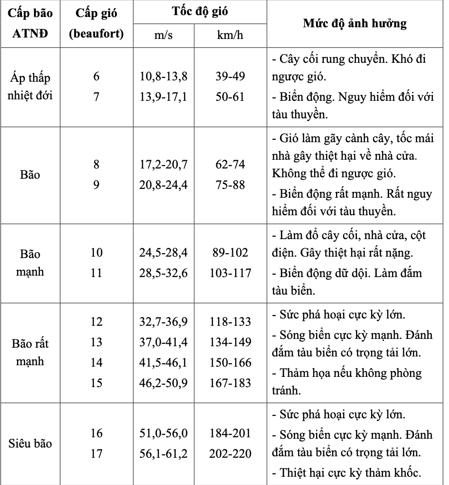Mô tả cấp gió bão và mức độ ảnh hưởng